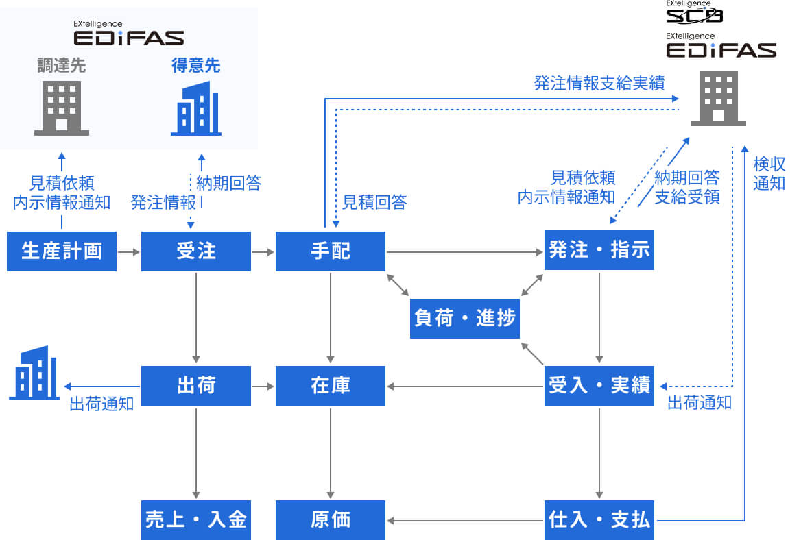 SCMやB2Bなどに対応する「つながる工場」の原点となります。電脳工場MFCには標準で連携モジュールが装備されているため、シームレスに様々なEDI情報共有が可能。