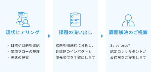 Salesforce®認定コンサルタントがお客様の課題を徹底的に分析し、経営課題を解決するための業務プロセスの改善、最適なシステム提案、システム設計の最適化、運用改善を行います。