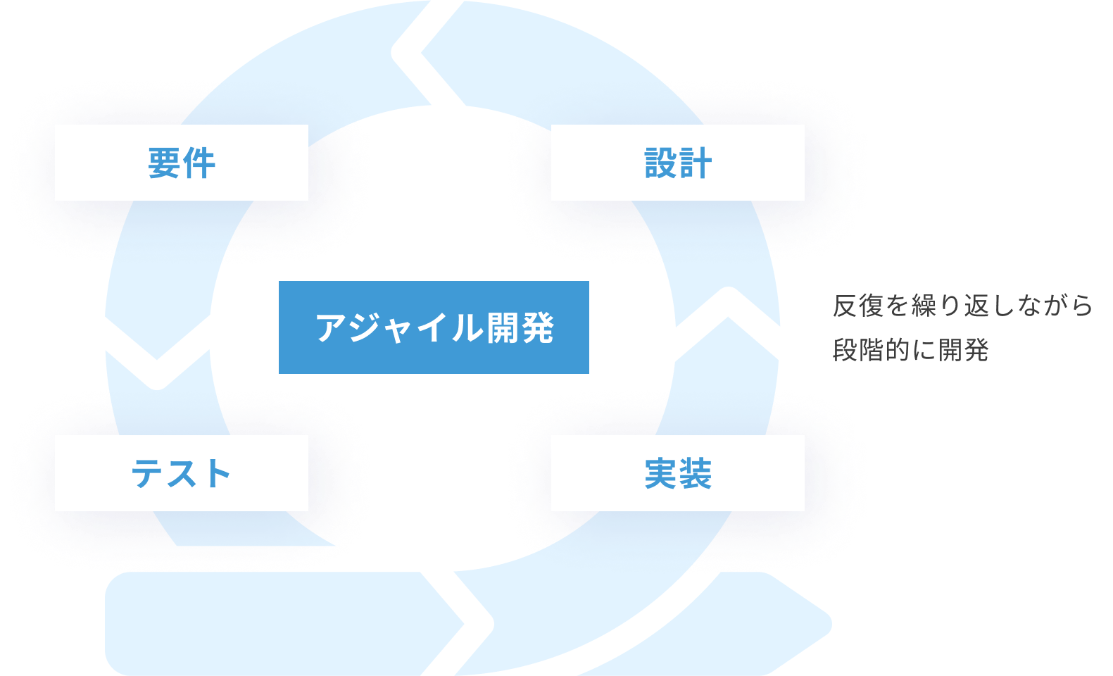 一般的な導入支援のケースでは、Salesforce® の標準機能を利用しお客様の要望をカスタマイズの範囲で対応します。この場合、要件定義や設計/設定は反復的かつ段階的に実施するアジャイル型のプロジェクトを採用します。アジャイル型のプロジェクトでは、要件定義の打ち合わせでお客様からいただいたフィードバックをもとに変更対応を柔軟に行い、プロトタイプ画面で動作を確認しながら設計、実装を繰り返すため、よりニーズに適したシステムを実現することが可能です。