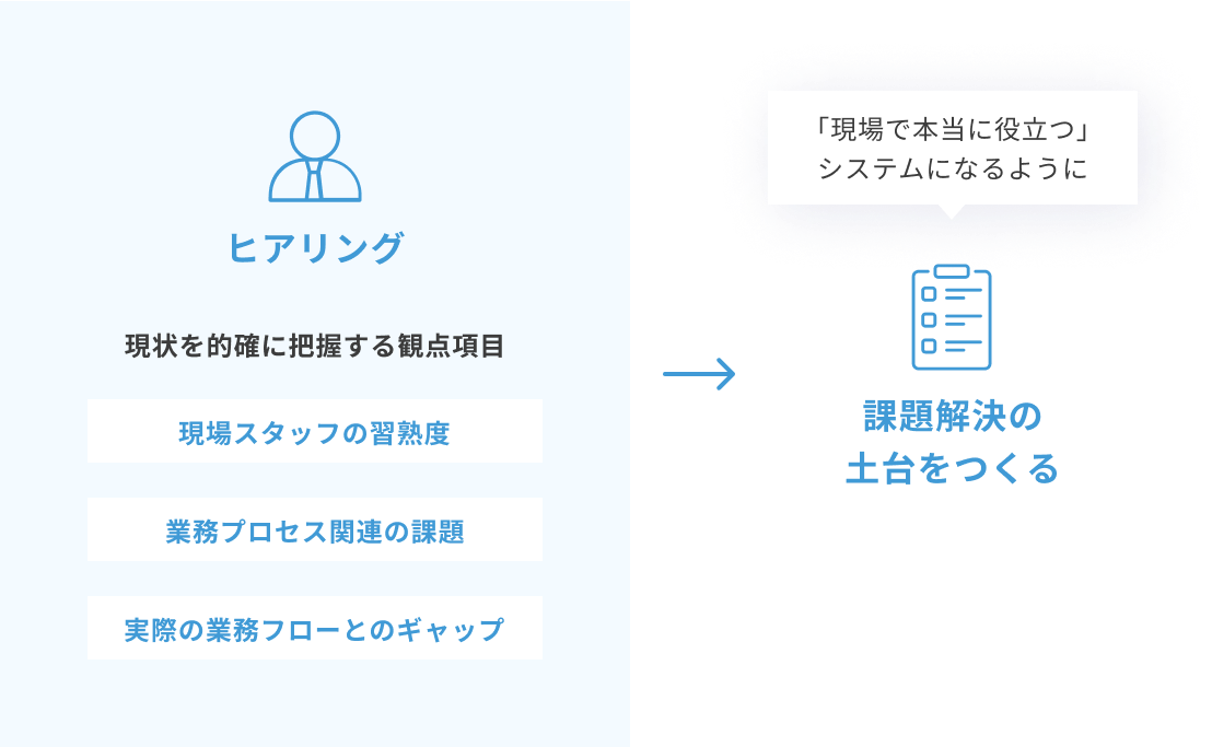 このプロセスを通じ、システムが「現場で本当に役立つもの」になるよう、課題解決の土台を作ります。