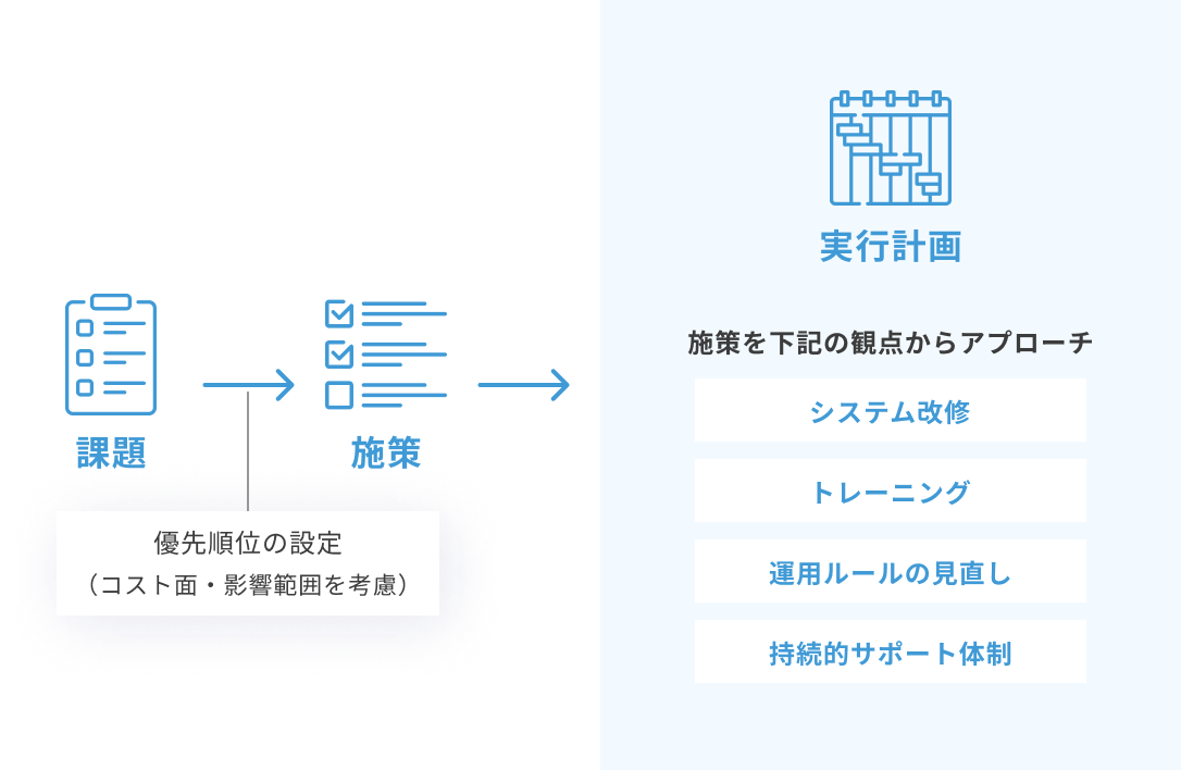 整理された課題の種類と範囲を特定し、具体的且つ測定可能な改善目標を設定します。それぞれの具体的な施策は、コストと影響範囲の観点から優先順位を決定し、実行計画に落とし込みます。実行計画は、システムの改修だけでなく、現場利用者向けのトレーニングや運用ルールの見直し、持続的サポート体制の強化など、お客様側の施策も一緒に検討します。