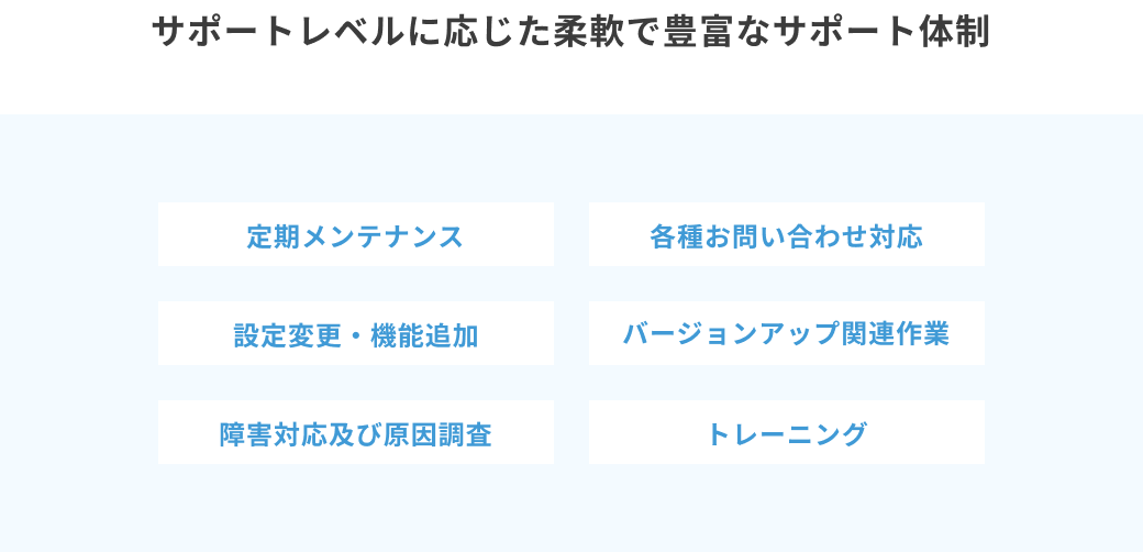 日常業務における利用者からの問い合わせ対応やデータの調査、定期的なバックアップ作業等、お客様の運用担当者が実施する作業をサポートいたします。また、Salesforce®システムの定期バージョンアップに伴う事前調査やシステムの確認、影響がでる設定の変更、新機能のご案内などのサポートも対応可能です。