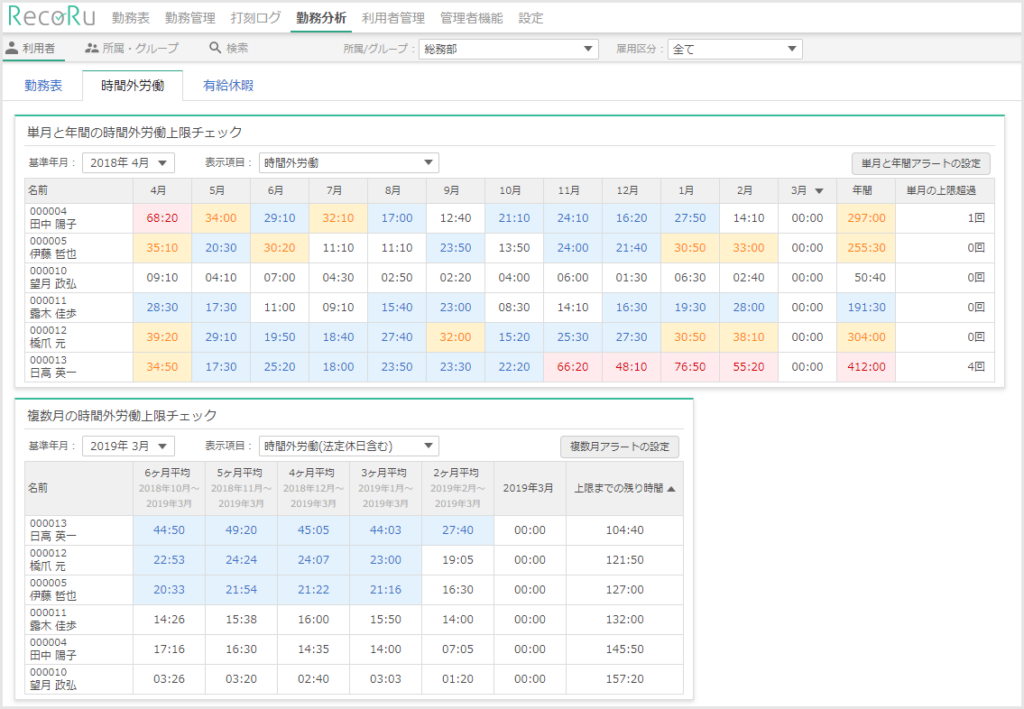 【時間外労働 管理画面】